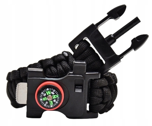 - Bransoletka ma wbudowane: nożyk, kompas, gwizdek i krzesiwo (do wzniecania ognia w dowolnym miejscu i czasie)