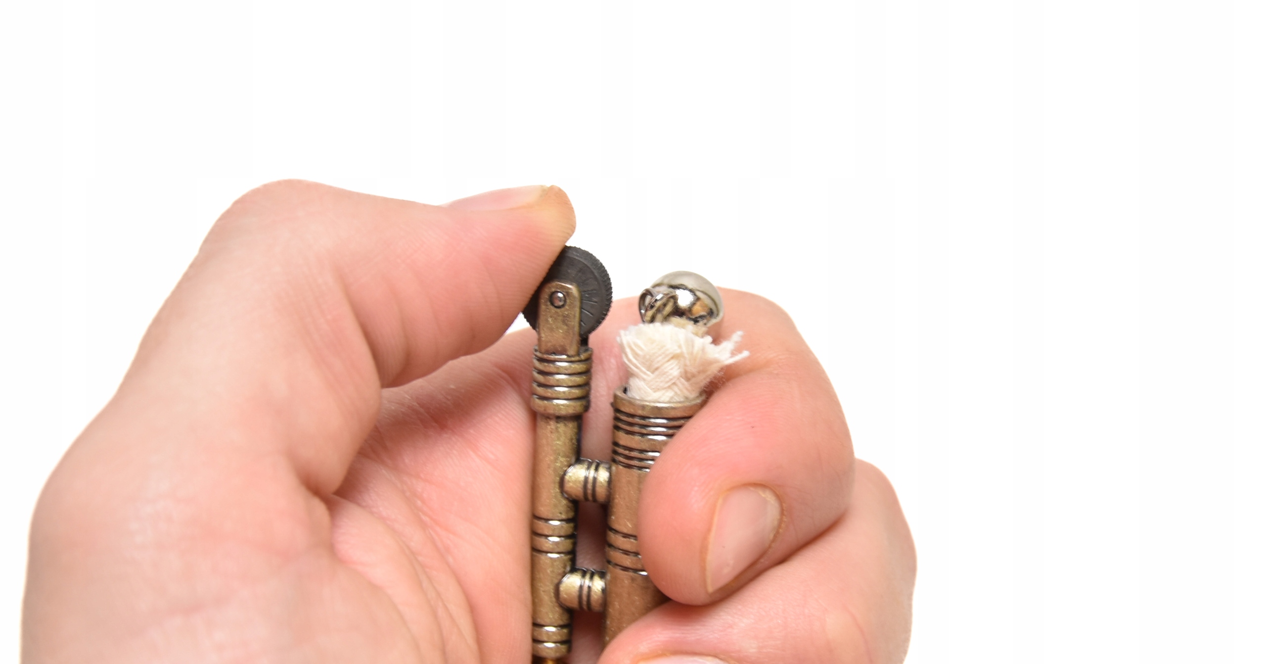 - To proste, wystarczy że wyciągniemy troszkę metalową kulkę przymocowaną do knota, dzięki temu będziemy mogli nasączyć knot benzyną, nasączony knot pod wpływem iskry łatwo się rozpali, gdy będziemy chcieli zgasić ogień wystarczy że pociągniemy za koniec knota a metalowa kulka przygasi nam płomień.