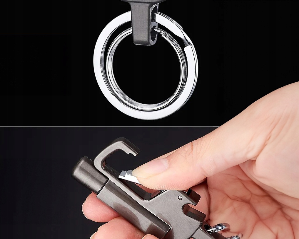- W naszym wielofunkcyjnym urządzeniu znajdziemy również, podwójne kółko do kluczy, gdzie przymocujemy nasze klucze i podzielimy je na dwie różne sekcje.