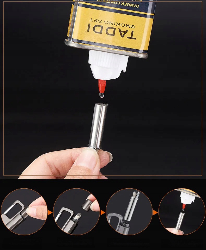- Pod odkręcanym wieczkiem znajdziemy zapalniczkę płomieniową którą odpalamy za pomocą krzesiwa, zapalniczkę uzupełniamy benzyną (podczas wysyłki zapalniczka nie jest napełniona benzyną)